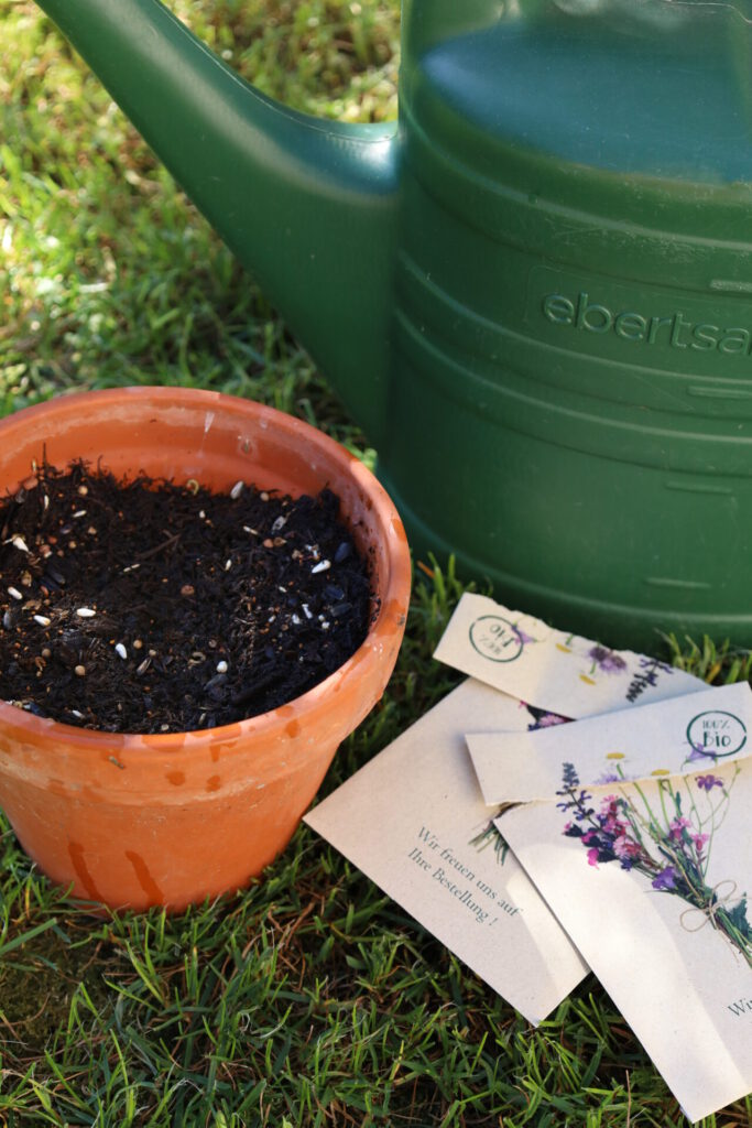 Du kannst die Samen breitwürfig oder in Reihen aussäen. Drücke die Samenkörner leicht auf die Erde, bedecke sie anschließend mit Erde und halte den Boden gleichmäßig feucht.